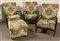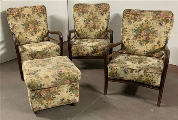 Lotto composto da tre poltrone con struttura in legno massello e cuscini asportabili rivestiti in tessuto a fiori; unite a un pouf di analoga fattura. Italia, anni '40/'50. (poltrone cm 58x78x65; pouf cm 45x27x45) (difetti)