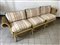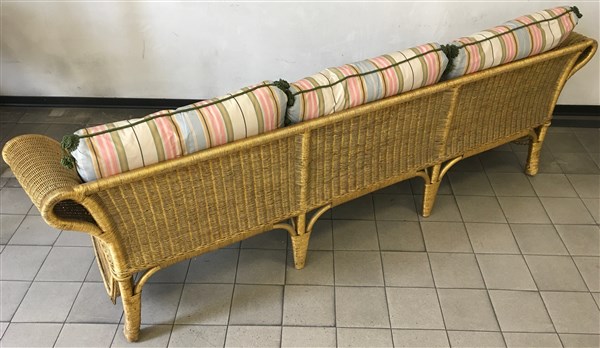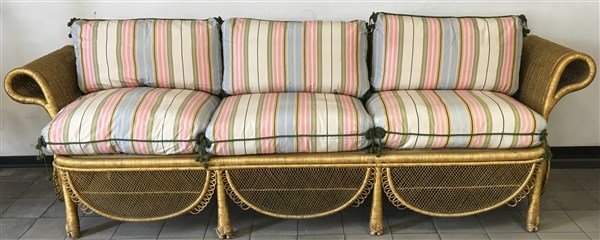 Divano a tre posti in vimini verniciato color oro, cuscini in tessuto a righe. Italia, secolo XX. (cm 240x67x67) (difetti e restauri)