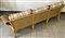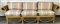Divano a tre posti in vimini verniciato color oro, cuscini in tessuto a righe.