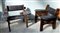 Coppia di poltrone rustiche in legno massello rivestite in cuoio nero borchiato