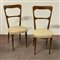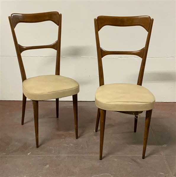 Coppia di sedie con struttura in legno massello, schienale a giorno e seduta imbottita e rivestita in similpelle creme. Italia, anni '50. (cm 41x95x50) (lievi difetti e restauri)