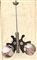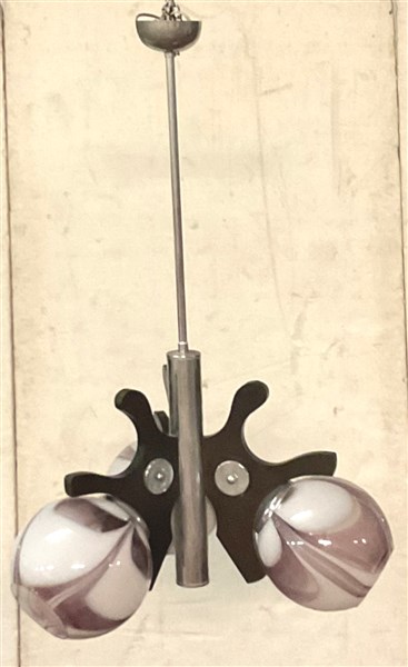 Lampada a sospensione a tre luci in metallo e legno con diffusori in vetro lattimo e ametista. (lievi difetti)