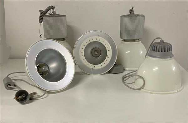 Lotto composto da tre lampade a sospensione modello "Minisosia Box" e due lampade a sospensione modello "Minisosia Opal". Produzione Castaldi illuminazione, Cassano Magnago, produzione recente. Diffusori in policarbonato e riflettori in alluminio. Recanti etichetta adesiva del produttore. (cm h 37 e cm h 27, d cm 30)(lievi difetti)