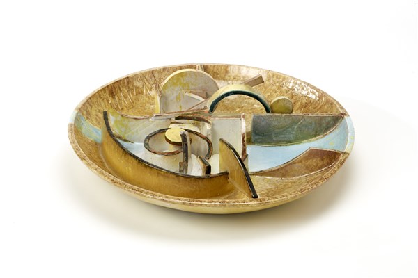 Piatto scultura con elementi a rilievo in ceramica smaltata sotto vetrina nei t