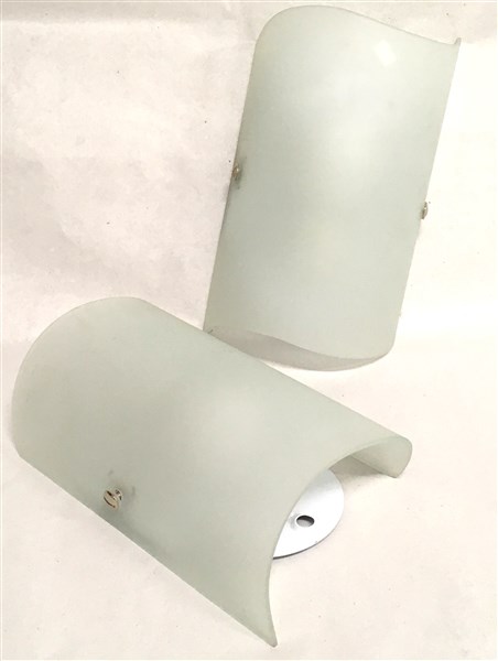 Coppia di lampade da parete con struttura in metallo bianco, diffusore in vetro acidato. Italia, secolo XX. (l cm 24)