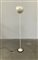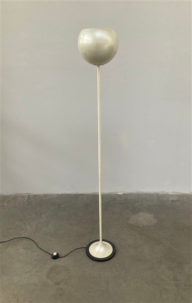 Lampada da terra con base in ghisa, fusto in acciaio, diffusore di forma globulare in alluminio smaltato color madreperla. Italia, anni '60/'70. (h cm 165) (lievi difetti)