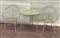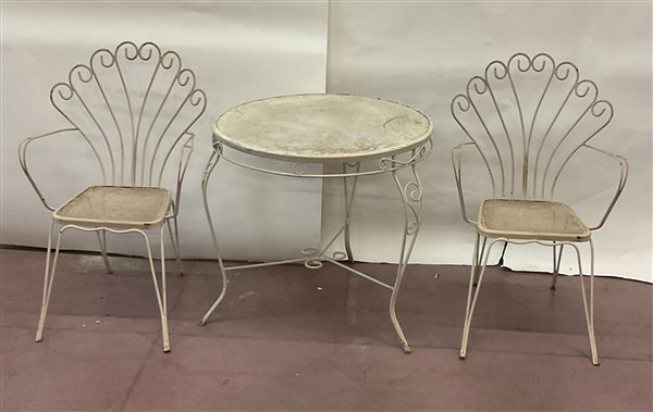 Lotto composto da un tavolo e due poltroncine da giardino in ferro verniciato bianco. Italia, anni '50. (tavolo cm h 71, cm d 75; sedie cm 56x9035) (difetti)