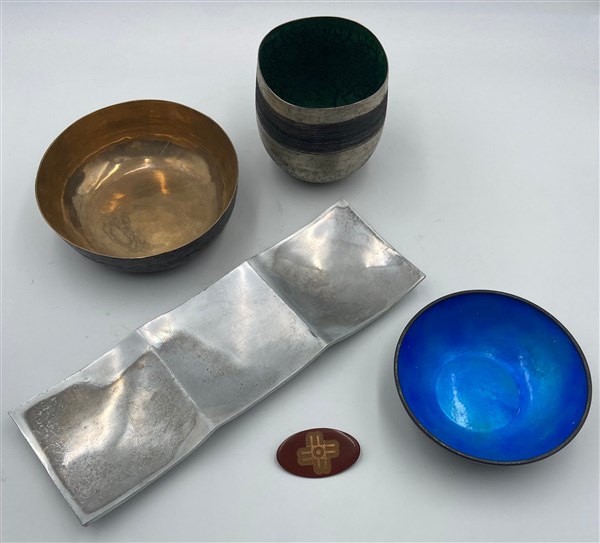 Lotto composto da un vassoio, due ciotole, un vaso e una spilla in metallo smaltato. Italia, secolo XX. (misure diverse) (lievi difetti)