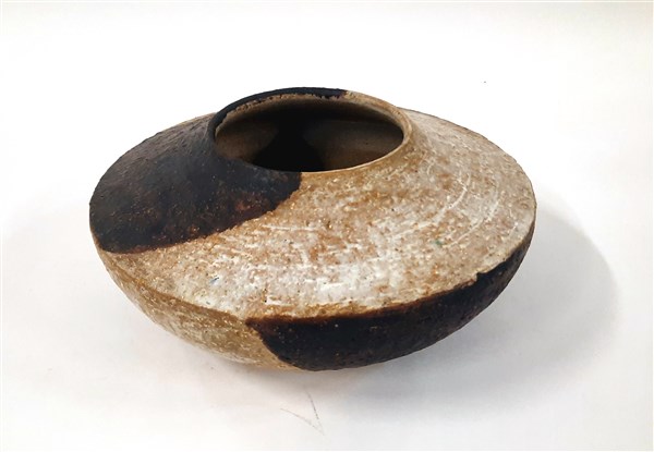 Vaso in gres smaltato in bruno, bianco crème e ocra. Anni '50. Marchio indecifrato sotto la base. (h cm 14; d cm 32) (lievi difetti)