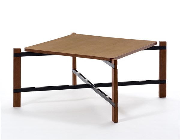 Tavolino da salotto con struttura in legno massello e impiallacciato, traverse a crociera in metallo verniciato nero. Italia, anni '70. (cm 80x40x80) (lievi difetti)