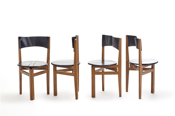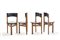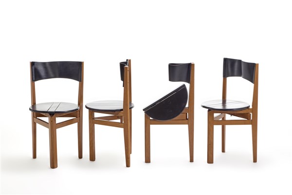Lotto di quattro sedie pieghevoli tripodi in legno massello con seduta verniciata nera e schienale in cuoio. (h cm 80,5; d cm 39,5) (lievi difetti)