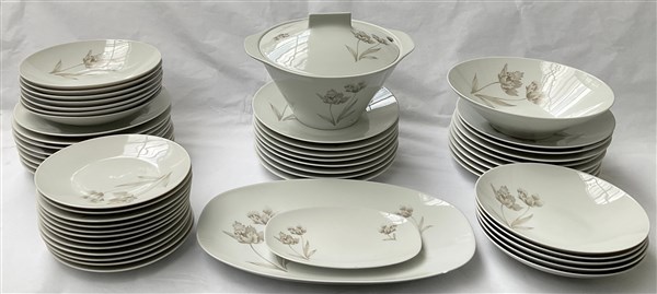 Manifattura tedesca. Servizio in porcellana bianca decorato con fiore grigio composto da: ventiquattro piatti piani, dodici piatti fondi, dodici piattini da frutta, una zuppiera, una insalatiera e due vassoietti di misure diverse (difetti e mancanze)