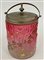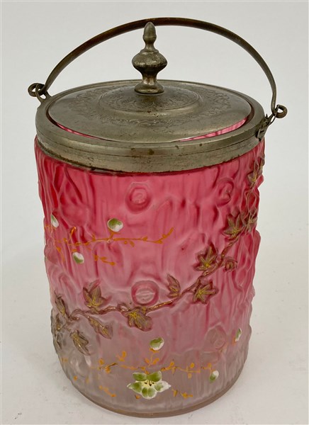 Biscottiera in vetro rosa dipinta in policromia con rami fioriti con coperchio in peltro inciso. (h cm 20) (difetti)