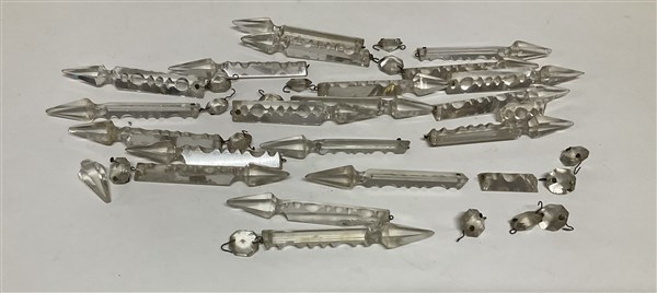 Coppia di candelabri in metallo dorato a quattro fiamme decorato a volute fogliate e pendenti in cristallo, basi tripodi traforate (h. cm 44) (difetti e mancanze)