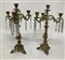 Coppia di candelabri in metallo dorato a quattro fiamme decorato a volute fogli