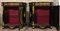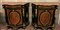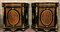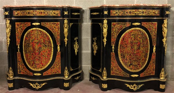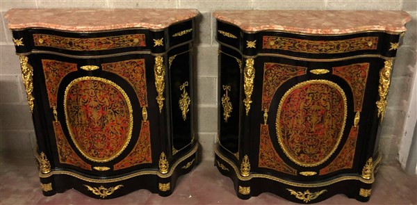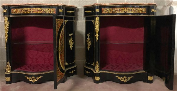 Coppia di credenze in stile Boulle di forma mossa in legno ebanizzato intarsiata in finta tartaruga. Fronte ad un'anta e un cassetto sottopiano decorata con fregi in metallo dorato. Montanti decorati con figure di erme, piano in marmo (cm 107x103x42) (difetti)