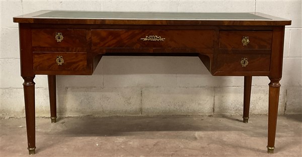 Scrivania da centro a quattro cassetti di cui uno con forziere, due tiretti ai lati. Piano con inserto in finta pelle verde. Gambe tornite con scarpette in bronzo, secolo XIX (cm 139x74x64) (difetti)