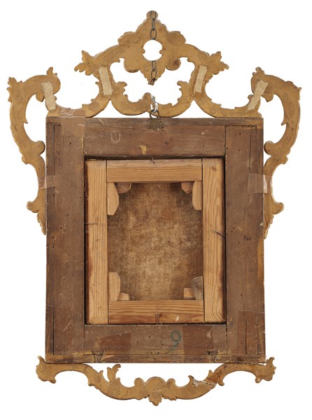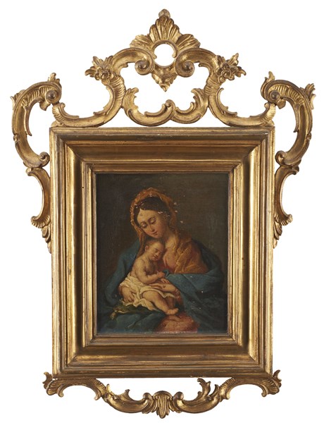 Ignoto, antico dipinto raffigurante Madonna con bambino. Olio su tela (cm 28x23,5) in cornice del secolo XVIII in legno dorato con fregi intagliati e traforati a volute