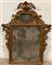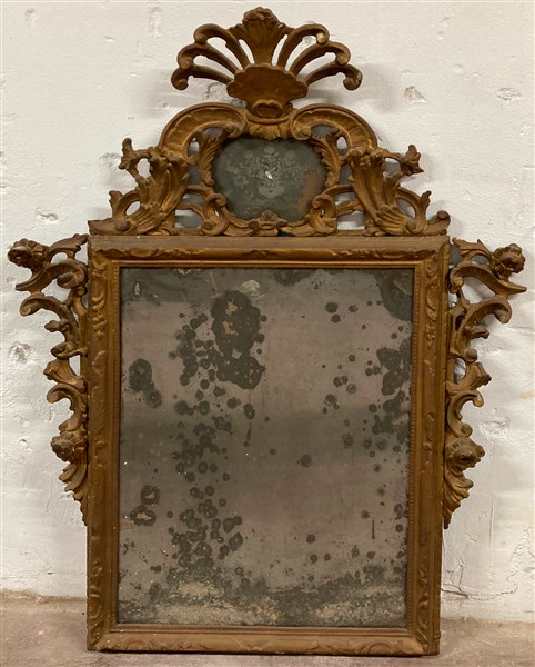 Specchiera in legno intagliato traforato e dorato a volute, fiorellini e motivi vegetali. Cimasa con fregio a motivo di conchiglia e piccolo specchio decorato con vaso fiorito. Secolo XVIII (cm 132x96) (difetti)