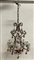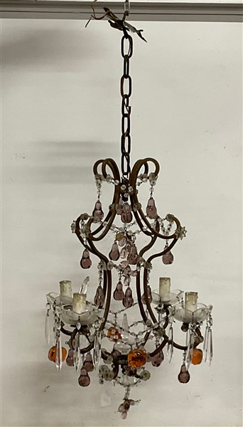 Lampadario a quattro luci con struttura in metallo, prismi e pendagli in cristallo a forma di frutti colorati (d cm 39) (lievi difetti)