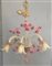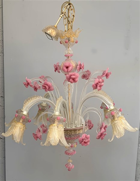 Manifattura di Murano. Lampadario a sette fiamme in vetro decorato nei toni del rosa a fiori, foglie e bugnature (h cm 100) (difetti e mancanze)