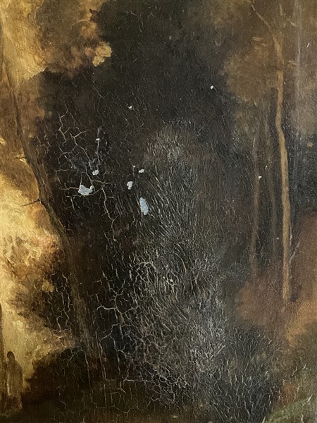 Ignoto "Paesaggio" olio su metallo (cm 44x26,5) in cornice in legno intagliato e dorato (difetti)
