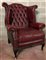 Poltrona a orecchioni rivestite in pelle bordeaux borchiata con gambe in legno