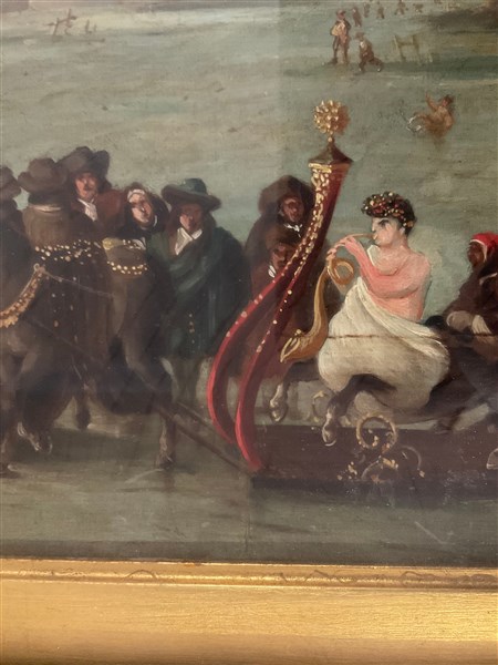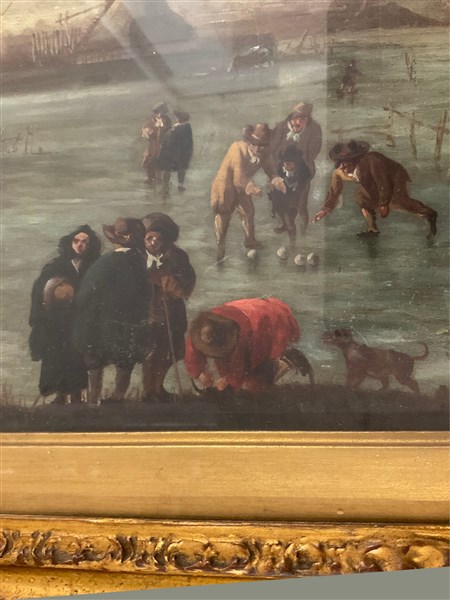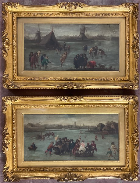 Coppia di dipinti ad olio su tavola raffiguranti "Pattinatori sul ghiaccio" (cm 22,5x43,5) In cornici