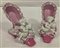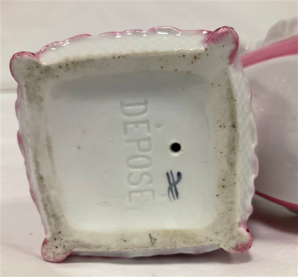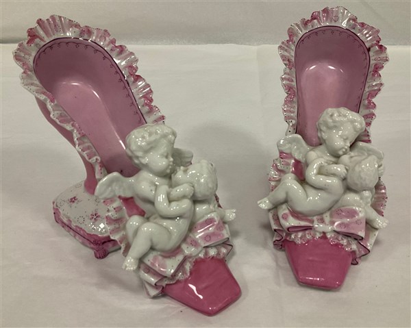 Manifattura francese, secolo XIX. Coppia di scarpette in porcellana policroma rosa decorata da putti. Marcato e iscritto alla base (h. cm 14) (difetti)