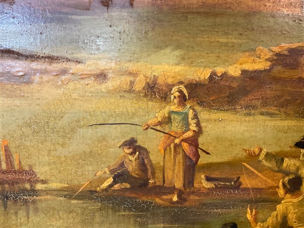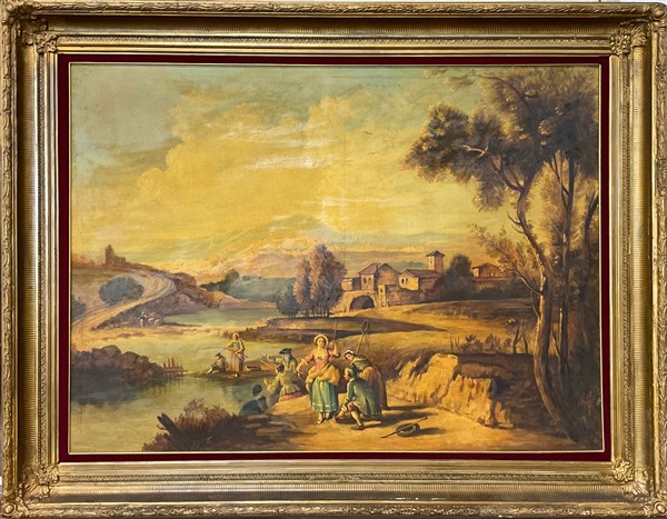 Ignoto, dipinto raffigurante figure in un paesaggio, olio su tela (cm 88x120) in cornice