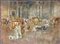 Firma indecifrata "Veduta con dame e carrozze" tecnica mista su carta (cm 42x56