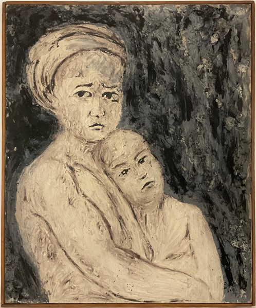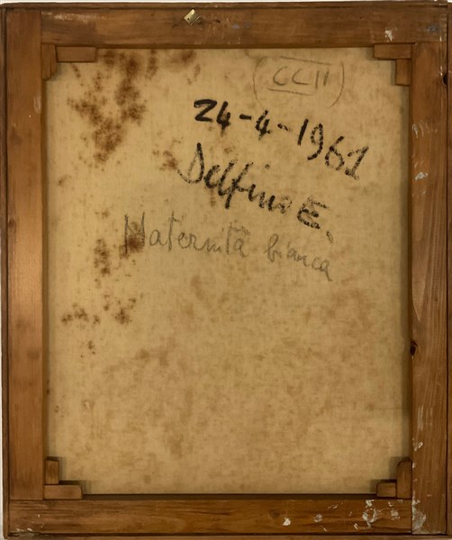 E. Delfino - "Maternità bianca", tecnica mista su tela (cm 60x50), firmata in basso a destra; titolato, firmato e datato 1962 al verso