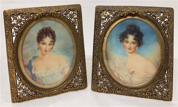 Coppia di miniature su avoriolina raffiguranti ritratti femminili (cm 7,5x5,5) in cornici (lievi difetti)