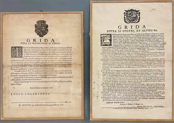Lotto 1763 | Lotto composto da due grida del Ducato di Modena sugli stupri del 1686 e 1715 (