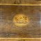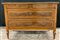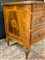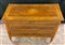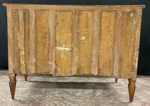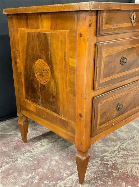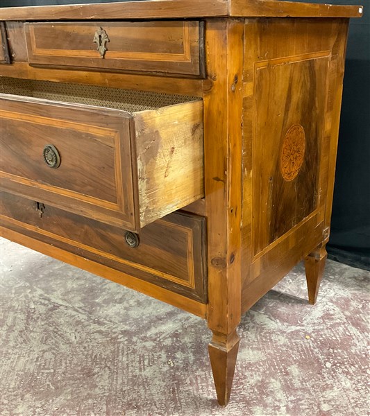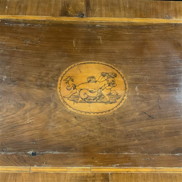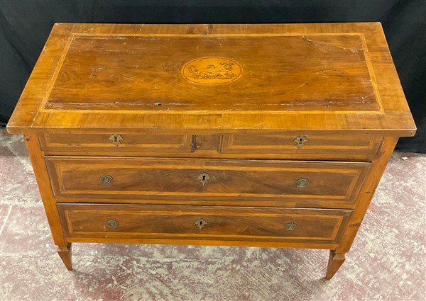 Comò in legno lastronato e filettato in legni vari, due cassetti sul fronte più due in linea sottopiano, decorato con medaglione intarsiato raffigurante una scena mitologica sul piano e rosoni sui fianchi. Piedi a obelisco rovesciato, guarnizioni in metallo. Secolo XVIII (cm 123x89x62) (difetti e restauri)