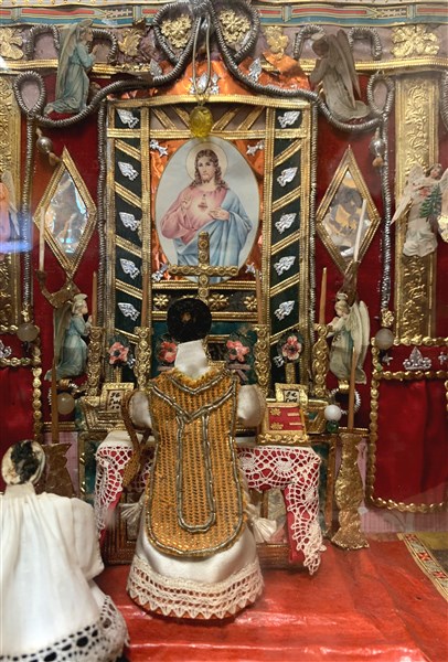 Diorama raffigurante un altare votivo con sacerdote e chierico, realizzato con