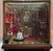 Diorama raffigurante un altare votivo con sacerdote e chierico, realizzato con carta, stoffa e applicazioni in metalllo. Entro teca in legno intagliato (cm 27x28x17) (difetti)