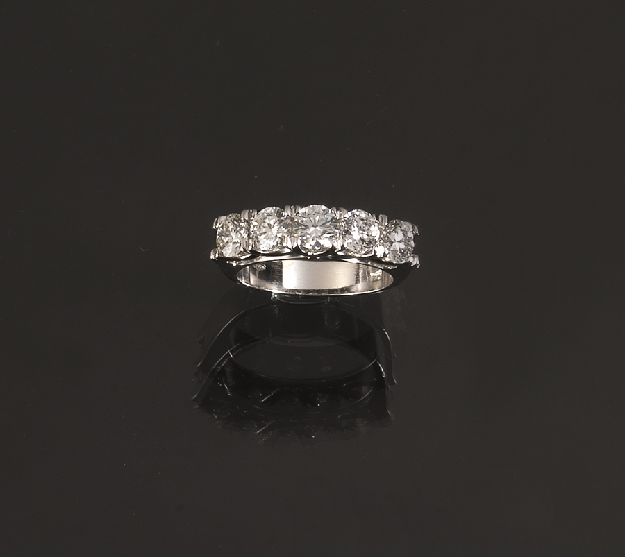 Anello rivière in oro bianco e diamantila parte superiore decorata da cinque...
