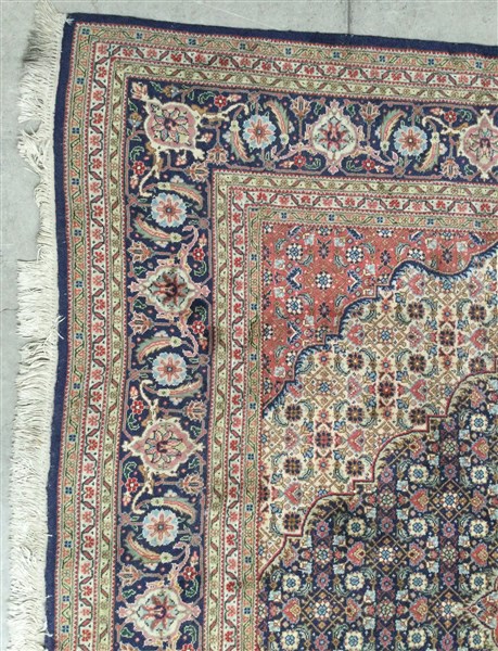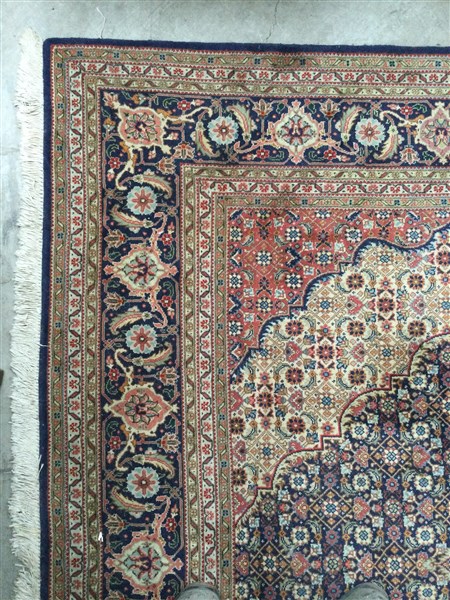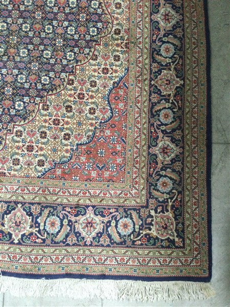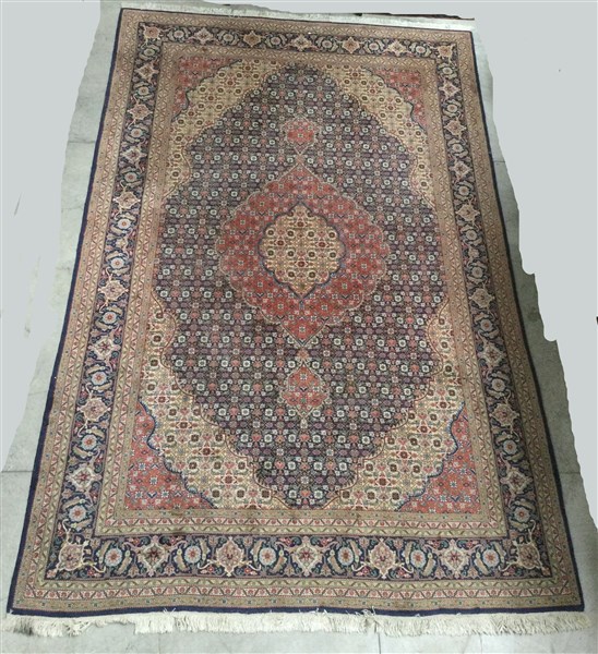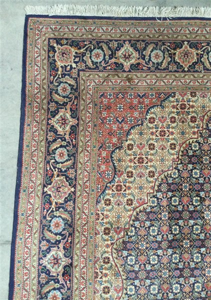 Tappeto Tabriz, Persia, secolo XX. Decoro con medaglione con puntali su fondo blu notte, ornati con motivo Herati (cm 319x200) (difetti)