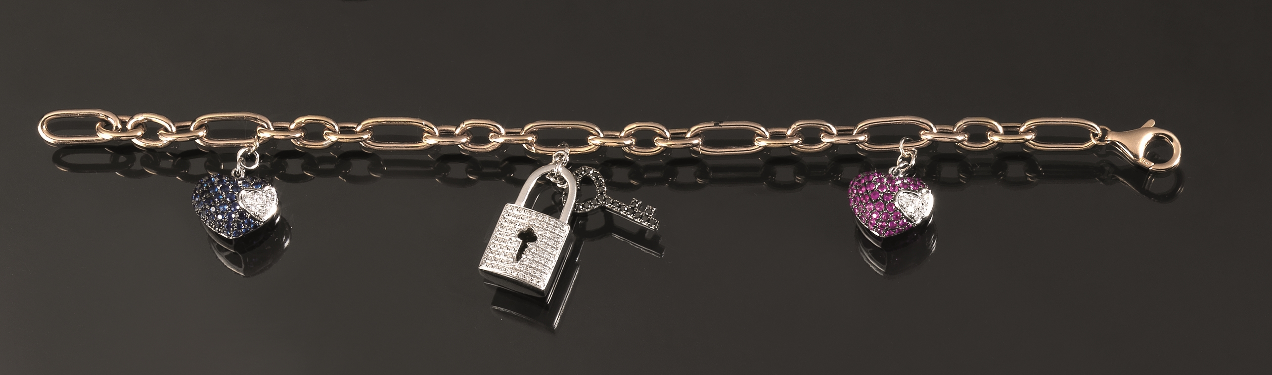 realizzato ad una fila di maglie ovali in oro rosa a cui sono sospesi tre charms rispettivamente modellati come un lucchetto con una chiave, entrambi in oro bianco decorati in brillanti incolori e neri e come due cuori bombati, in oro bianco e pavè di zaffiri e rubini con inserto in brillanti, g 19