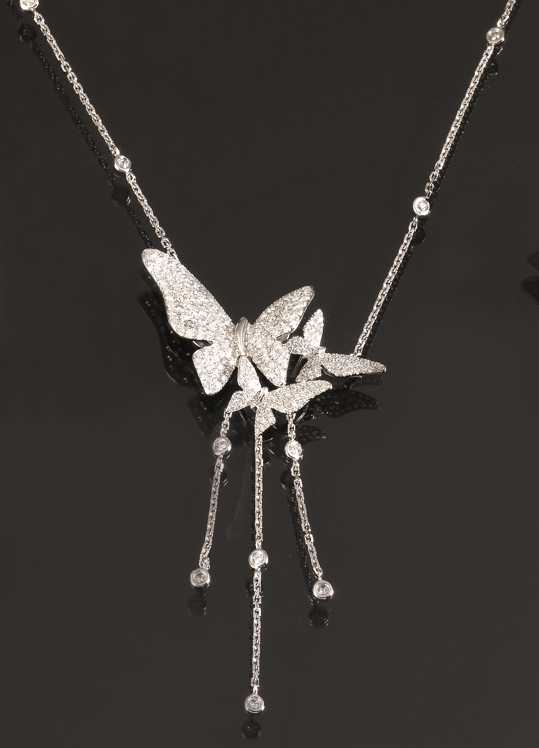 realizzata con un catena a maglia sottile lungo cui si intercalano piccoli brillanti, al centro un motivo composto da tre farfalle decorate in pavè di brillanti a cui cono sospese tre linee analogamente realizzate alla collana, brillanti per ct 2,20 circa, g 11
