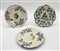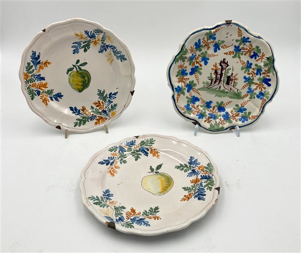 Manifatture differenti. Lotto di tre piatti in maiolica a bordo sagomato. Due decorati in policromia a frutti, l'altro a paesaggio tra rami fioriti (gravi difetti)