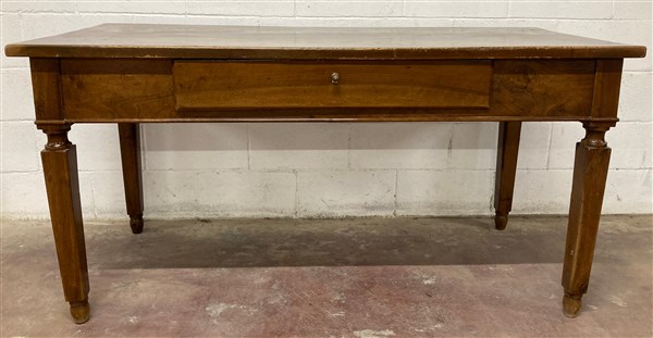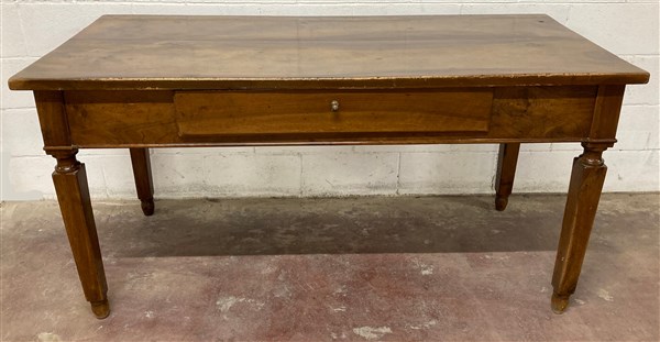 Tavolo in noce di forma rettangolare ad un cassetto sottopiano poggiante su gambe squadrate e tornite. Secolo XIX (cm 160x80x72)