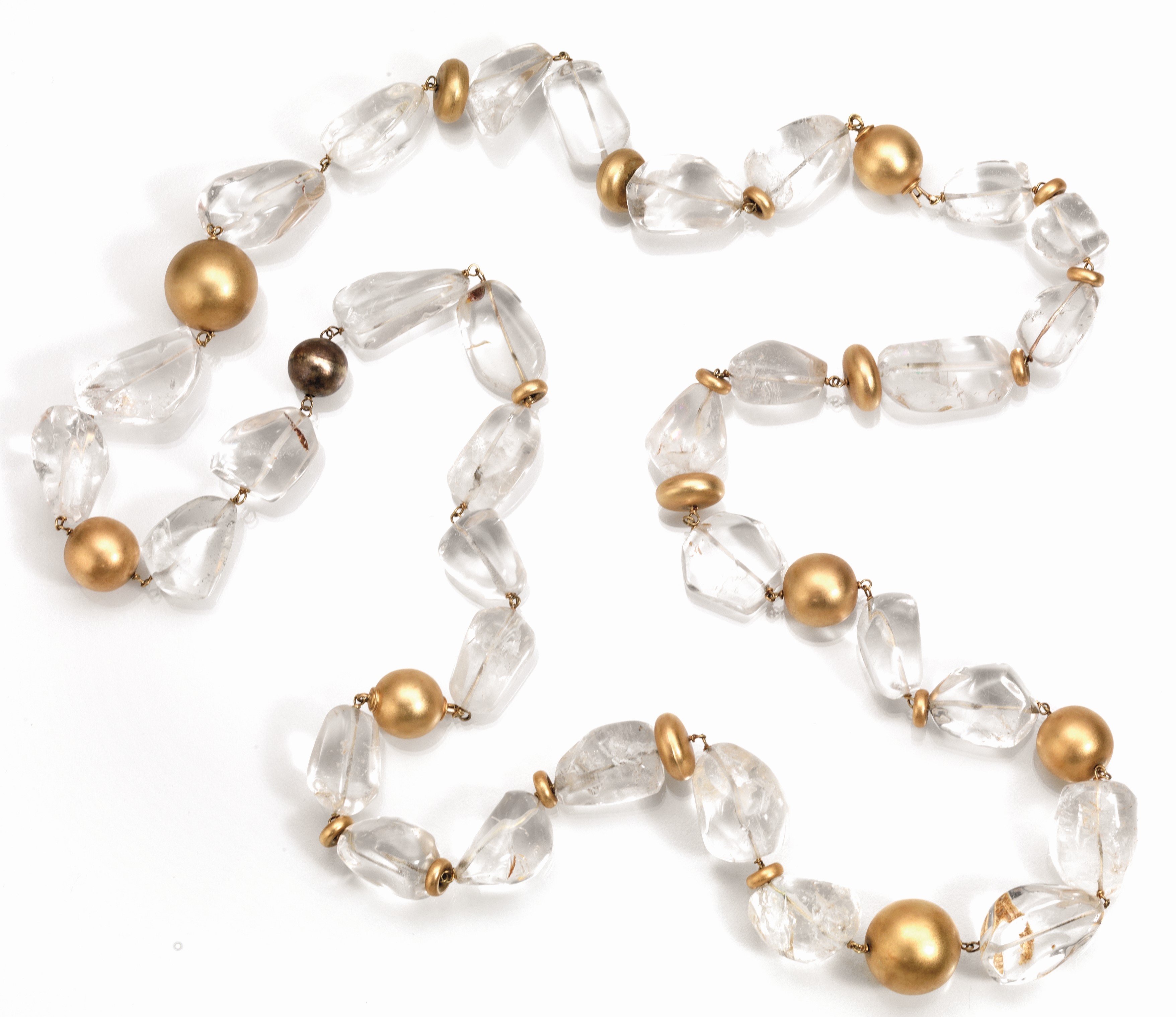 ciascuna realizzata ad una fila di cristalli di rocca irregolari intercalati da sfere e anelli bombati in oro satinato. Le due collane sono unibili a formare una collana più lunga (2)