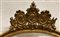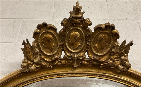 Specchiera patriottica di forma ovale in legno intagliato e dorato con fregi a conchiglia. Cimasa decorata a volute, cartigli, simboli militari e tre medaglioni con trionfi di bandiere all'antica dove sono raffiguranti i profili di Guglielmo I Hohenzollern (al centro), von Moltke, comandante in capo dell'esercito, e Otto von Bismarck. Ideata e prodotta per celebrare la vittoria del Primo Reich sui francesi. Produzione germanica, 1872 circa (cm 100x116) (difetti)