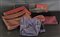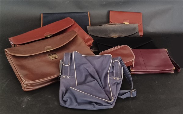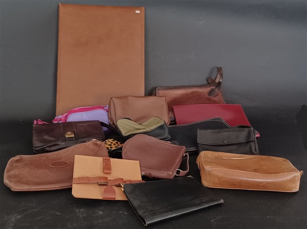 Lotto di due scatoloni contenenti quattro borse da lavoro, svariati borsetti e trousses da toilette e portadocumenti in diversi materiali tra cui alcuni in cuoio (cm varie) (gravi difetti)