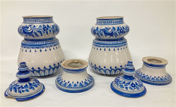 Coppia di vasi in ceramica di forma mossa decorati nei toni del blu a fiori e volute. Fine secolo XIX (h. cm 53) (difetti e rotture)