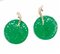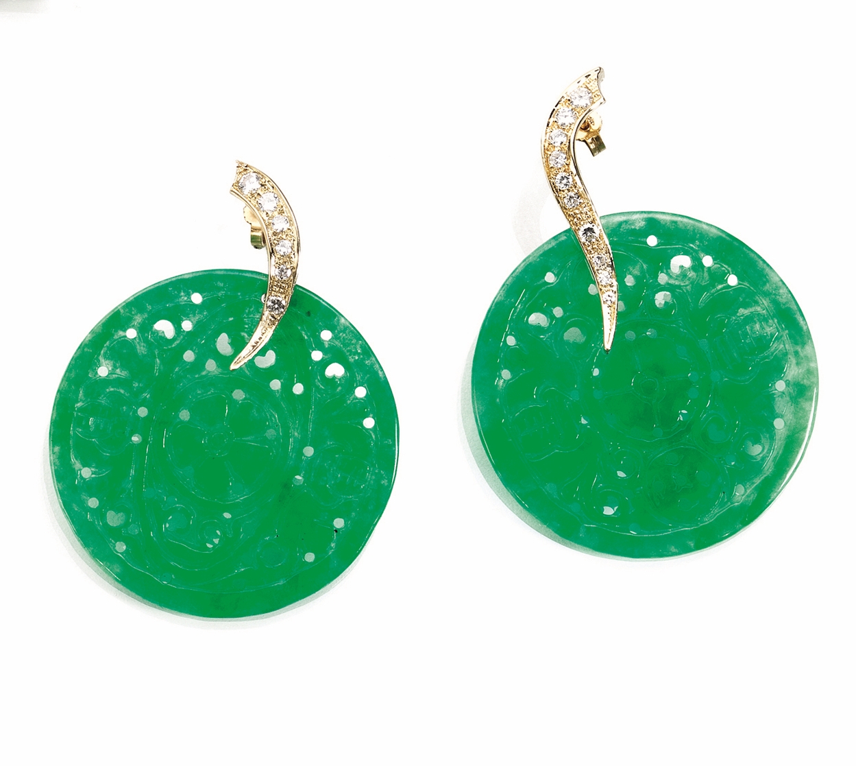 ciascuno realizzato con un motivo a virgola in oro giallo decorata da una linea di brillanti posti in gradazione a cui è sospeso un disco in giada verde traforata a volute e motivi floreali, g 24