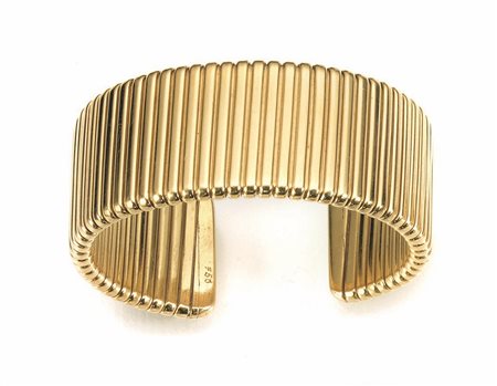 Bracciale in oro giallo a cerchio semirigido realizzato come un'alta fascia...