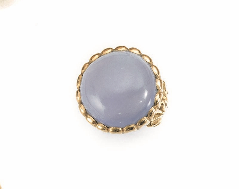 decorato da un grande calcedonio circolare cabochon montato entro un castone cesellato a corolla con foglie, g 15